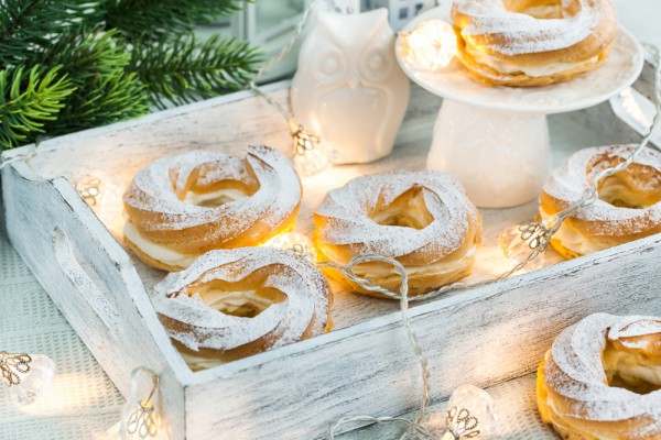 7. Колечки разрезать пополам и наполнить их кремом. Посыпать сахарной пудрой и хорошо остудить перед подачей.