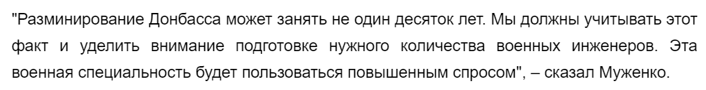 Муженко отметил, что на проведение полной очистки Донбасса от мин потребуется не менее 10 лет, а может, и больше. Он подчеркнул, что Украина должна быть готова к этой сложной военной операции, а учебные заведения должны уже сейчас готовить военных инженеров и саперов.