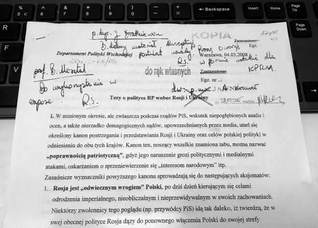 Этот документ, который называется "Тезисы о политике Республики Польша в отношении России и Украины", был подписан 4 марта 2008 года. С ним ознакомились лишь 4 человека, после чего его засекретил в МИД Польши Радослав Сикорский.