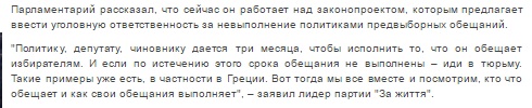 Далее он предложил невероятный подход – введение уголовной ответственности для тех политиков, которые не выполняют свои предвыборные обещания. Шутка ли, таким образом, он подставил под удар свою же партию и Мураева.